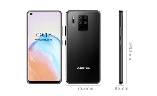 Oukitel C18 Pro has the modern hole-punch display with front camera in the left top corner. There is quad camera, flashlight and fingerprint scanner in the center of the rear panel.