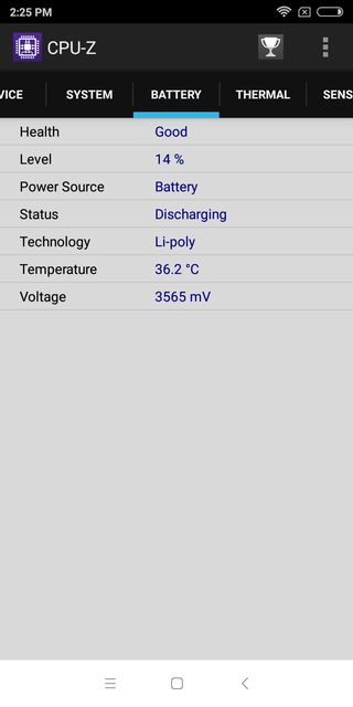 Below you can see screenshots from CPU-Z app. They show you detailed information about CPU, battery, system, thermal, sensors.